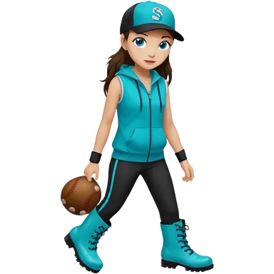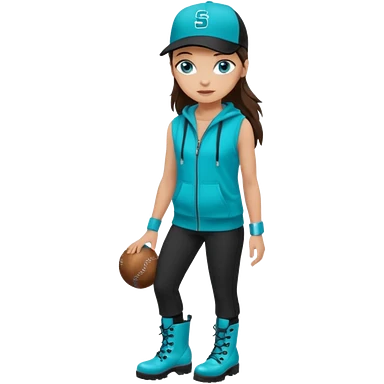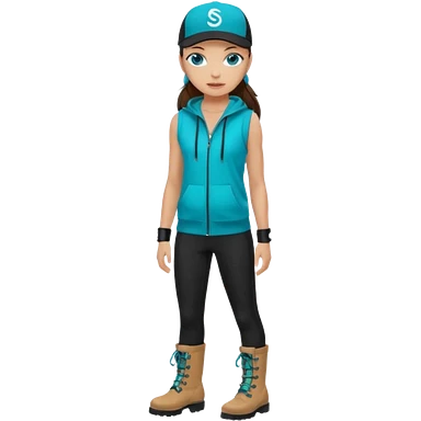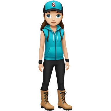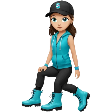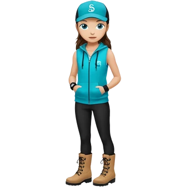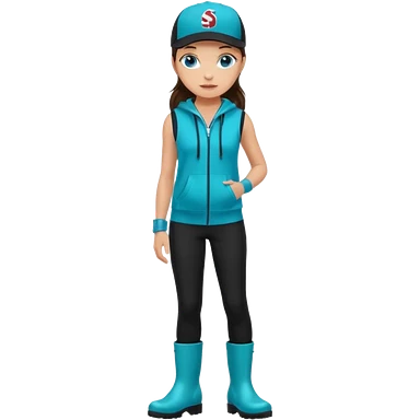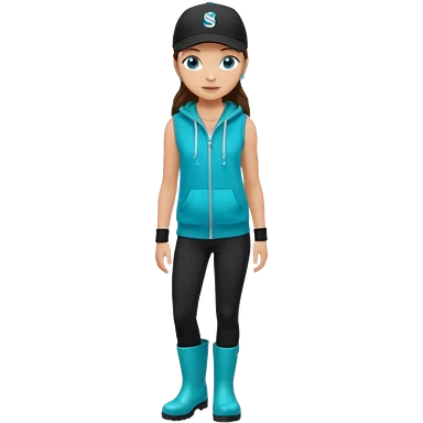 A landscaper in a beautiful turquoise hoody and turquoise rubber boots, black pants, and a black sleeveless shirt. On her head is a black color Swissotel baseball cap. The girl is a brunette with blue eyes. emoji