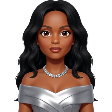 Diana Ross with brown eyes, long black hair, silver metallic off shoulder dress, silver necklace emoji