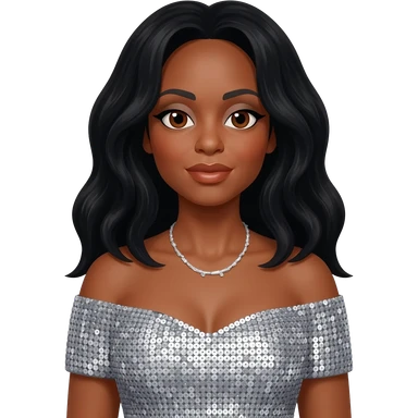 Diana Ross with brown eyes, long black hair, silver sequin off shoulder dress, silver necklace emoji