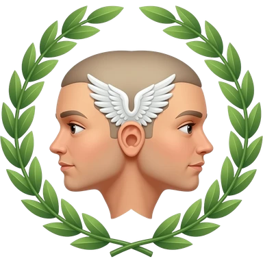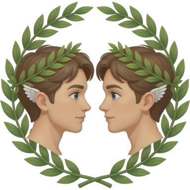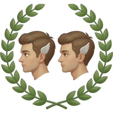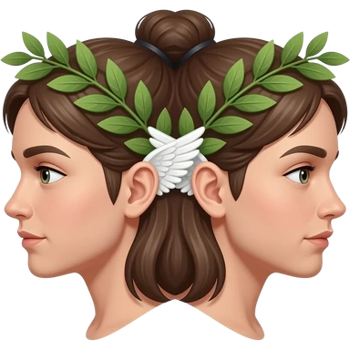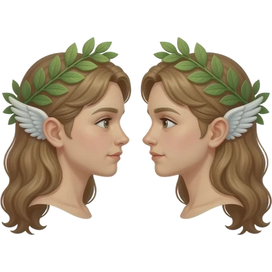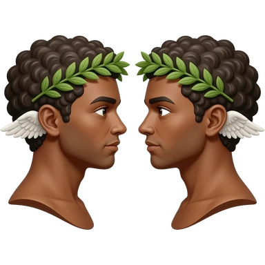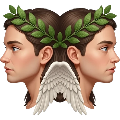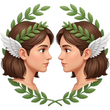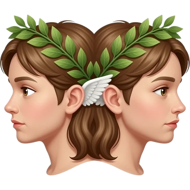 twins two faces in profile in a symmetrical composition, instead of ears they have small wings around their heads a laurel wreath emoji