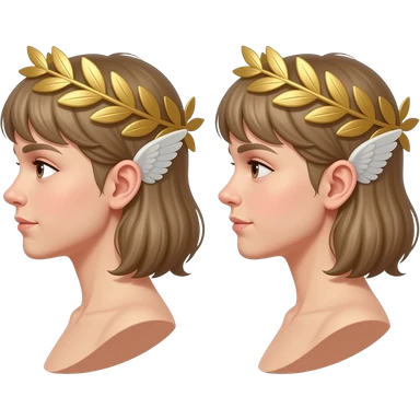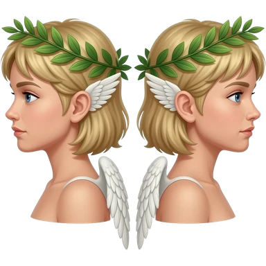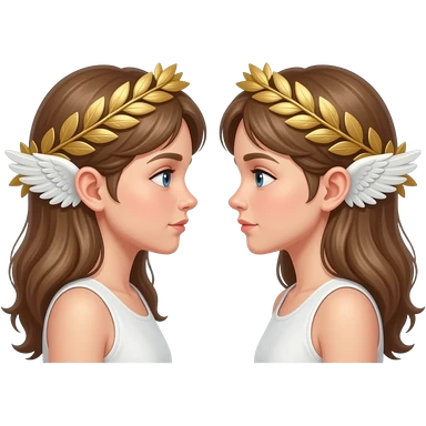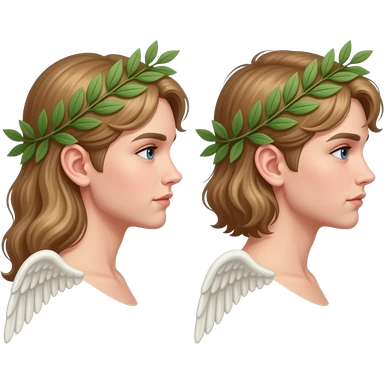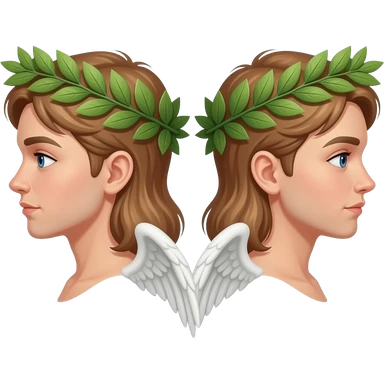 twins, two faces in profile in a parallel composition, they have small wings instead of ears and a laurel wreath around their heads emoji