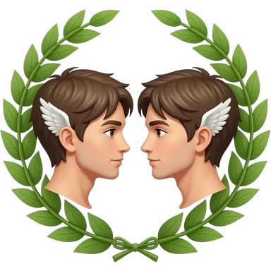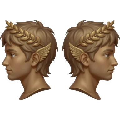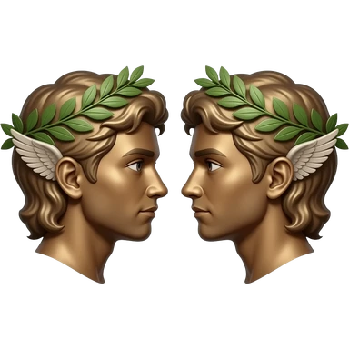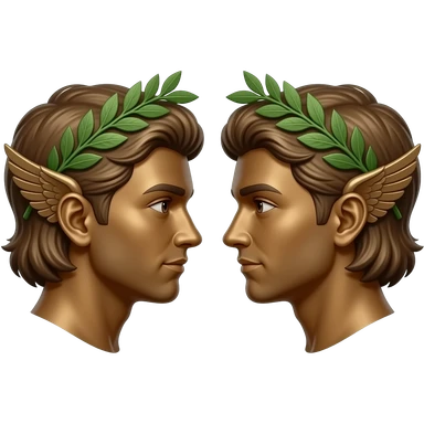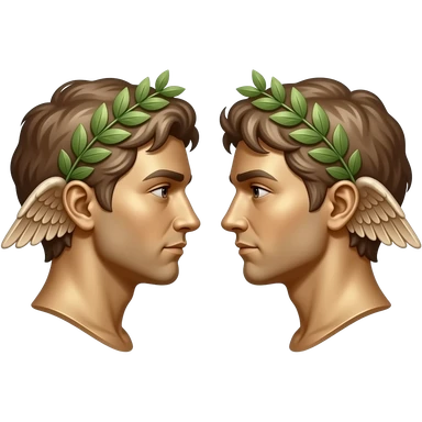 twins, two bronze faces in profile in a parallel composition, they have small wings instead of ears and a laurel wreath around their heads emoji