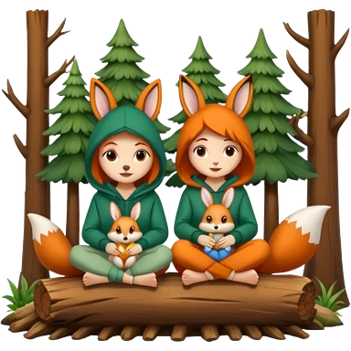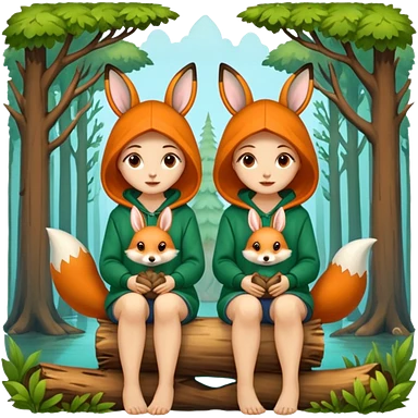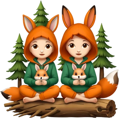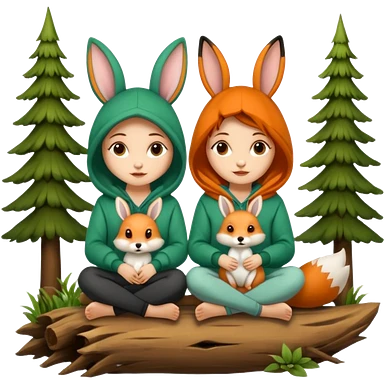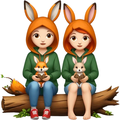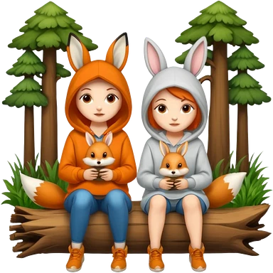 two forest women with cute fox and rabbit hoodies sitting together on log emoji