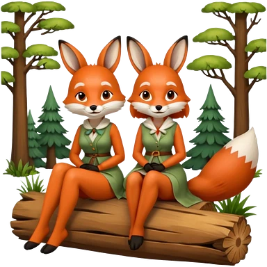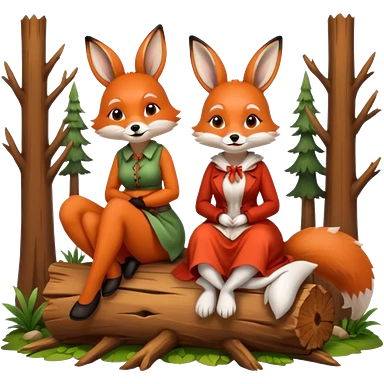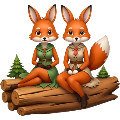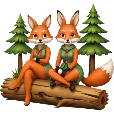 two forest women dressed as fox and rabbit sitting together on log emoji