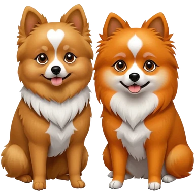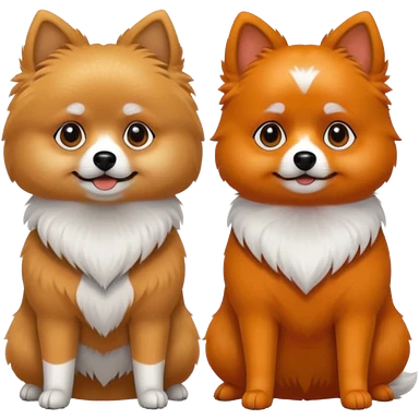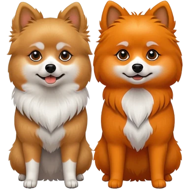 TWO POMERANIANS STANDING NEXT TO EACH OTHER. GIRL WHITE WITH ORANGE PATCHES AND BOY ALL BLACK WITH WHITE ON SNOUT AND CHEST . EMOJI DOGS. emoji