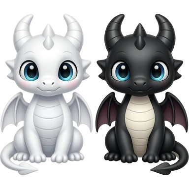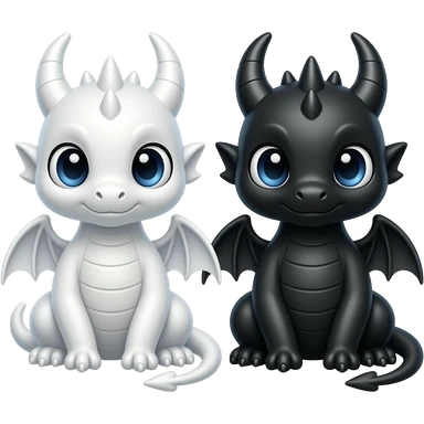 Two cute dragons (white and black) sitting side by side, facing forward, big expressive eyes, small rounded bodies, folded wings. Apple iOS emoji style, soft 3D, glossy, minimal, centered, transparent background. emoji