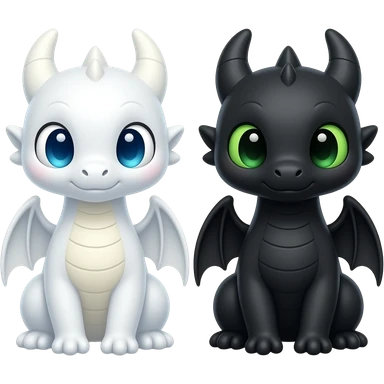 Two cute dragons (white (blue eyes) and black (green eyes)) sitting side by side, facing forward, big expressive eyes, small rounded bodies, folded wings. Apple iOS emoji style, soft 3D, glossy, minimal, centered, transparent background. emoji