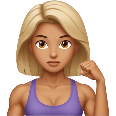 big biceps, muscled torso, very beautiful italian happy girl, looking like Emma Watson, with wavy curly bright hazelnut hair, dressed in violet bra sports outfit, very muscled emoji