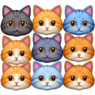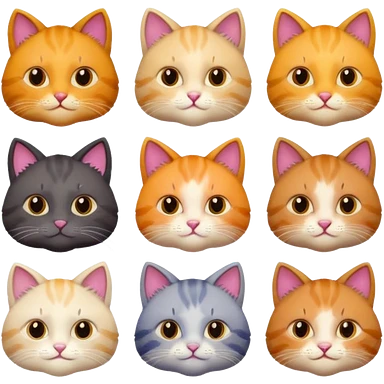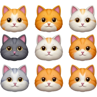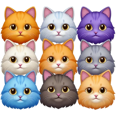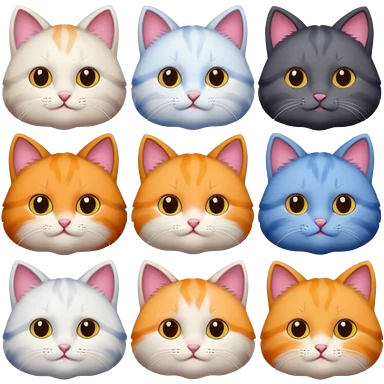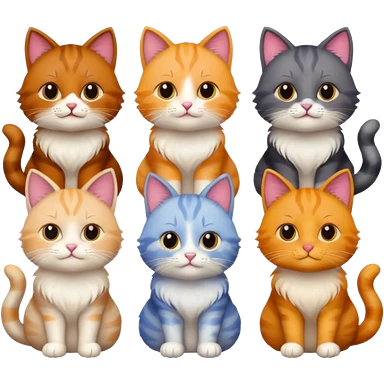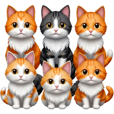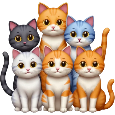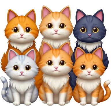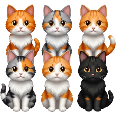 6 cats with different coloured coats, 2 are grey and white, 1 is grey with a little white, 1 calico, 1 brown tabby and white and one ginger and white emoji