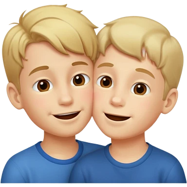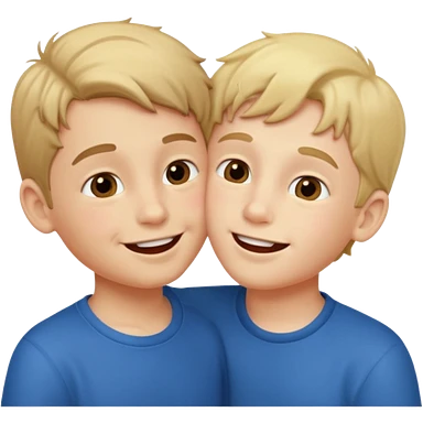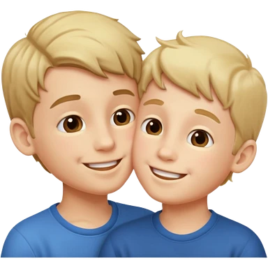 There are two boys kissing, because they are in love. Boy 1 is wearing a gray shirt and has blonde hair, boy 2 is wearing all pink and has light brown hair. emoji