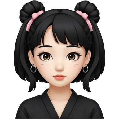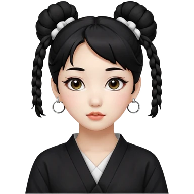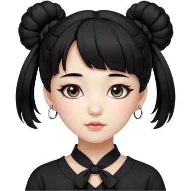 a beautiful girl face, wearing cute korean makeup, black hair, tied into two buns low near the ears with front bangs, kpop idol emoji