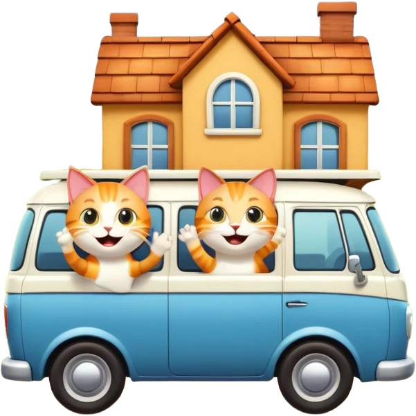 two cartoon cats in a van waving out the window at a small house in the background emoji | AI Emoji Generator