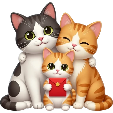 two cats cuddling with a kitten holding a red envelope emoji