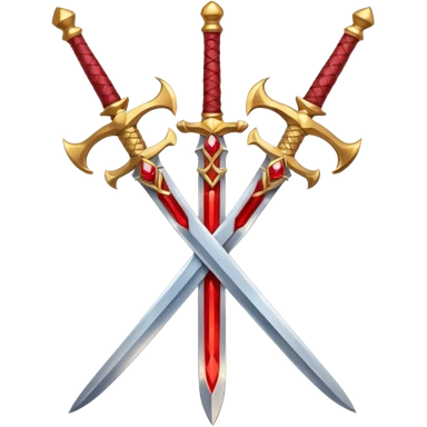 Two crossed swords that are golden in blade and handle and have fiery and royal appearence to them as well as red gem stones yellow in color emoji