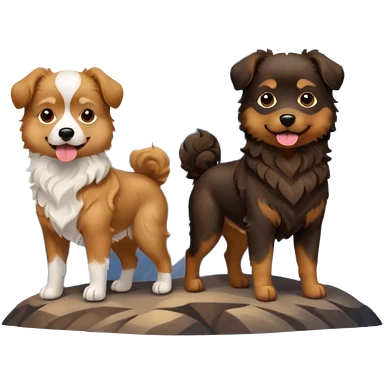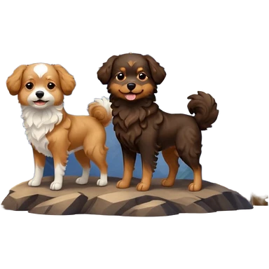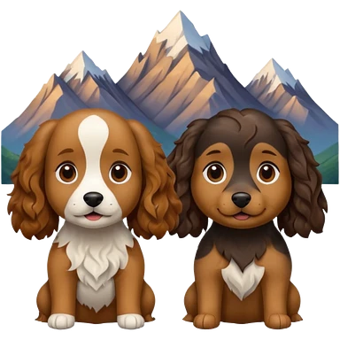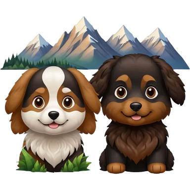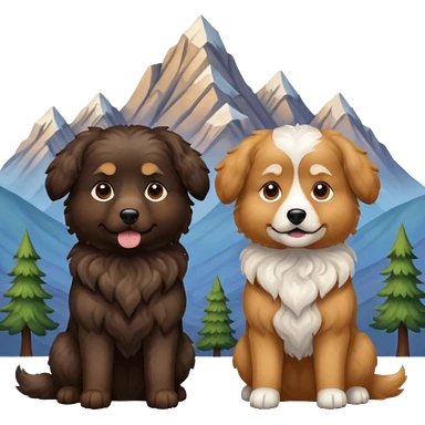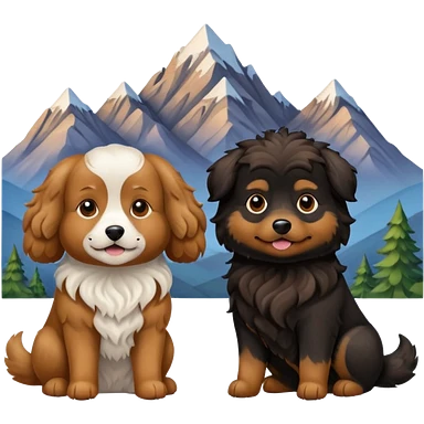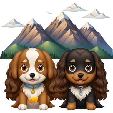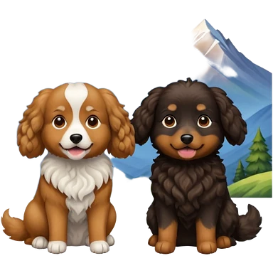 two dogs with wavy hair, one black and brown, one shades of brown with mountains emoji
