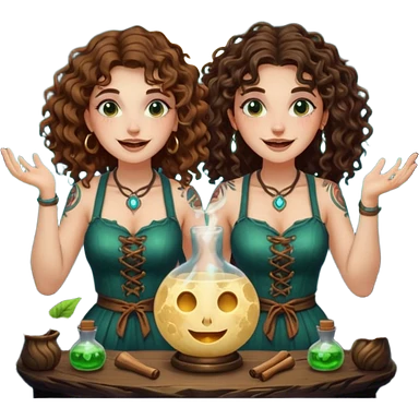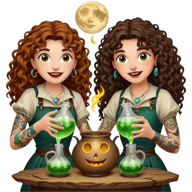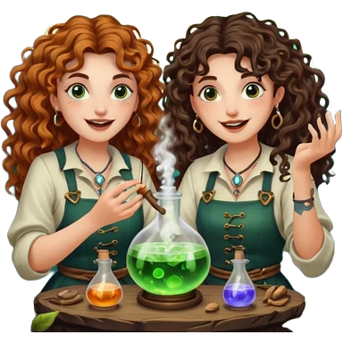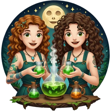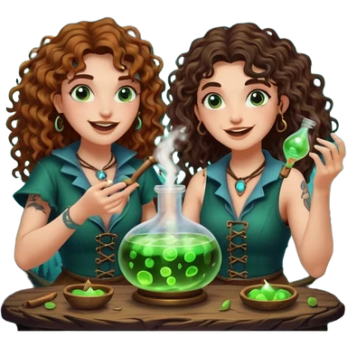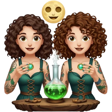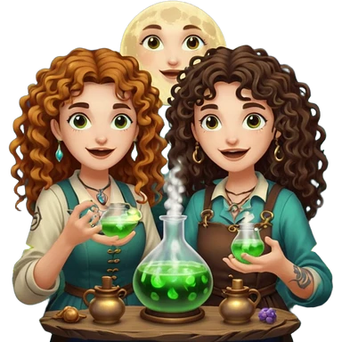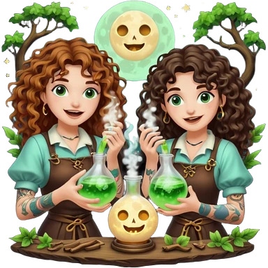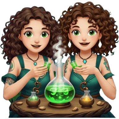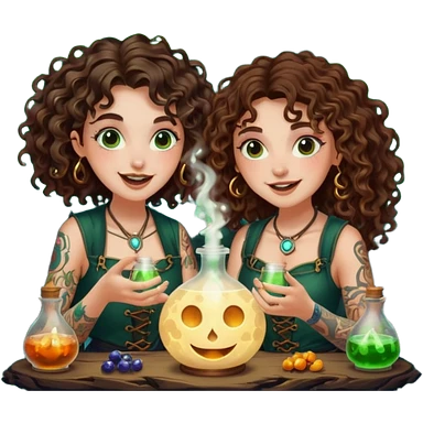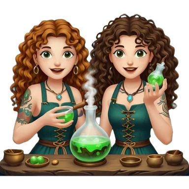 two forest alchemist women one long wavy brown hair tattoos one short tight curly brown hair clinking glowing vials emoji | AI Emoji Generator