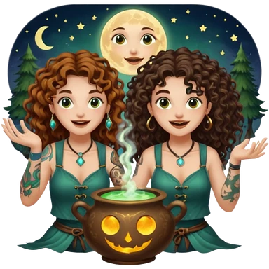 forest alchemist duo two women curly long hair tattooed and short brown hair mixing glowing moon potion together excited faces emoji