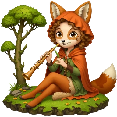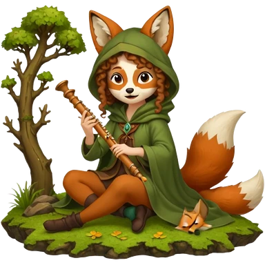 forest sticker character, woman with curly brown hair dressed as fox bard, tail cloak and ear hood, sitting on moss playing flute emoji