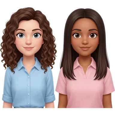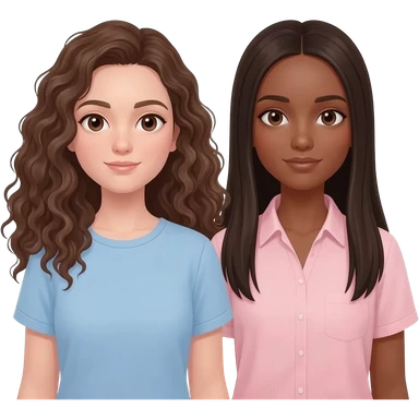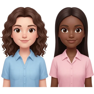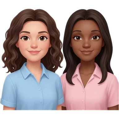 two friends one is white skin white brunette curly hair shoulder length and light blue shirt. Other friend is brown skin dark brown hair long light pink shirt emoji
