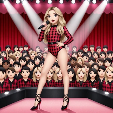 Sabrina carpenter singing at concert wearing a black and red plaid bodysuit a red sheer top over it , a strip of black lace around her leg, black sparkle heels. there is a huge crowd and light pink stage setting emoji