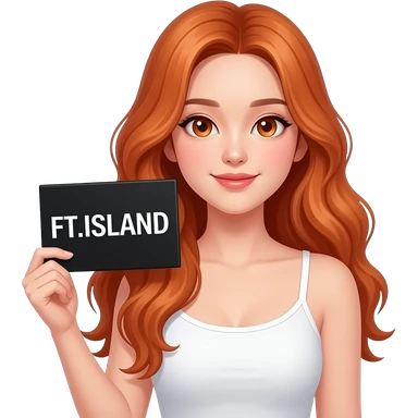 sexy girl with long wavy ginger hair and ginger eyes wearing a white tanktop is holding a black colored sign with FT.ISLAND written on it emoji