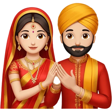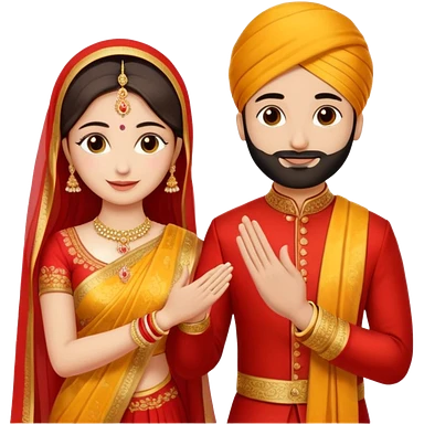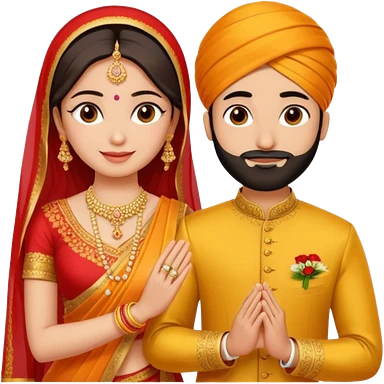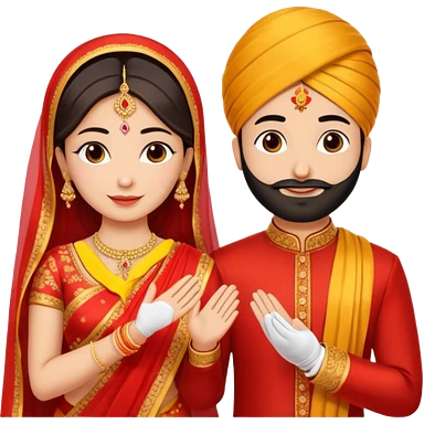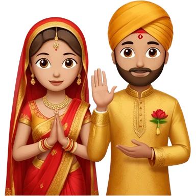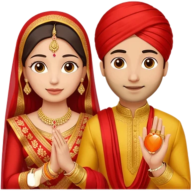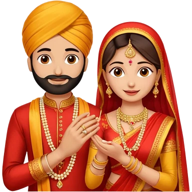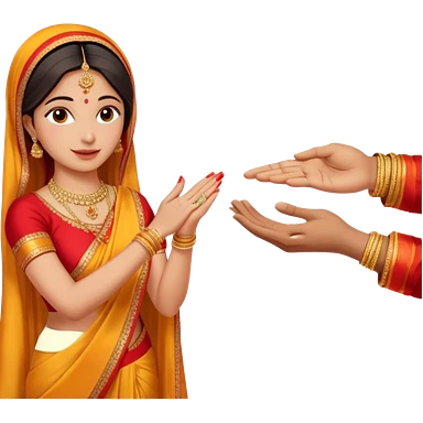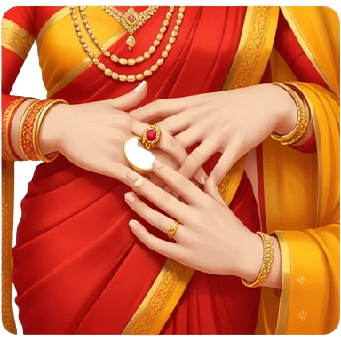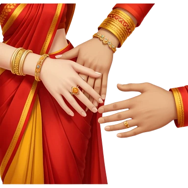 Two hands in a engagement..One hand of groom and one hand of bride. Bride hand - red/yellow saree. groom- light orange punjabi (oonly hands will be visible in the image). Groom's hand is holding a ring and bride's hand will be wearing the ring.*ONLY HANDS WILL BE VISIBLE IN THE IMAGE* emoji