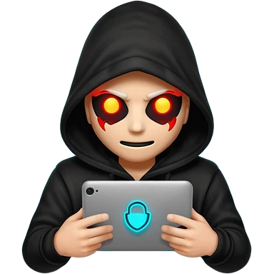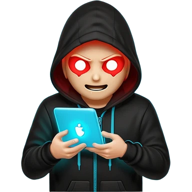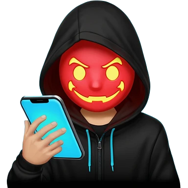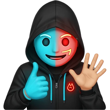 Black-hooded neon hacker emoji, red and cyan glow only, slamming glowing text “FTHESCAMMERS” with impact flash, aggressive anti-scam vibe, smooth 2-second loop, transparent background, Discord sticker style, no new colors. emoji