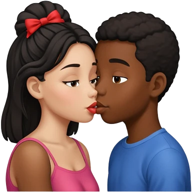 Two girls kissing one girl is blonde and is wearing a pink dress she has black hair and a pink bow the other girl is white and has brown hair with a pink bow and she wears a pink dress emoji