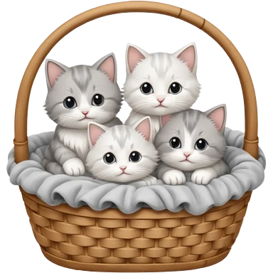 Ultra detailed, realistic, hd quality, fluffy long haired adorable white and gray newborn kitties in a wooden basket with a blanket emoji