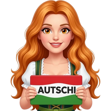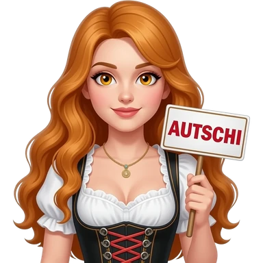 sexy girl with overlong ginger hair and ginger eyes wearing a dirndl holding AUTSCHI sign emoji