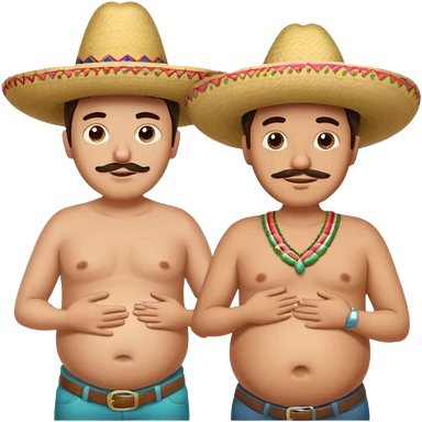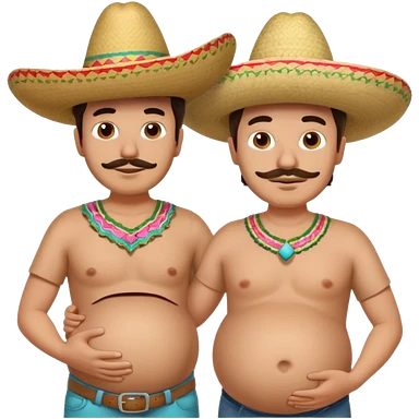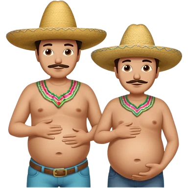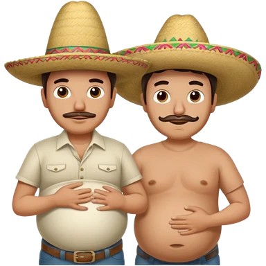 two men standing besides each other. 1 man is white and not pregnant, and the other man is mexican wearing a sombrero and pregnant, holding his belly. emoji | AI Emoji Generator