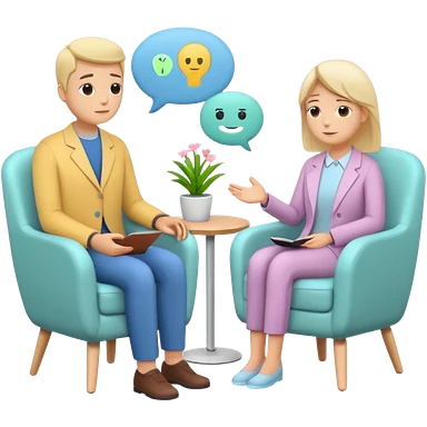 simplified human character sitting in a chair talking calmly with a psychologist, therapist listening attentively, safe and supportive atmosphere, mental health session, flat custom emoji sticker, pastel colors, rounded shapes, minimal details, thick outline, white background, no text emoji
