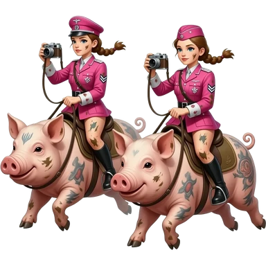cinematic realistic - Two skinny and dirty female riders in pink World War II German army uniforms ride jumps on large tattooed pigs with photo-binoculars in their hands emoji