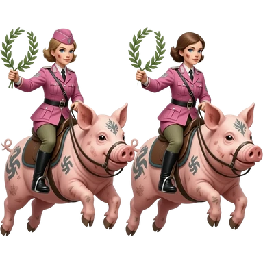 synthwave style - two skinny and dirty female riders in pink German army uniforms from World War II ride jumping on large tattooed pigs with laurel branches in their hands emoji