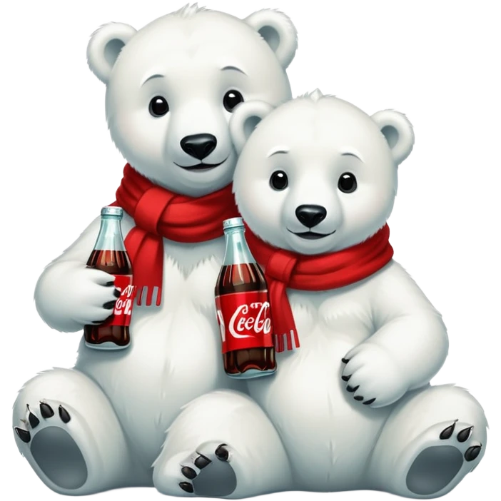 Two polar bear Cubs with Coca-Cola bottles and red scarfs emoji | AI Emoji Generator