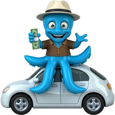 A squid BLUE with Brown shirt and hat white and on car with money emoji