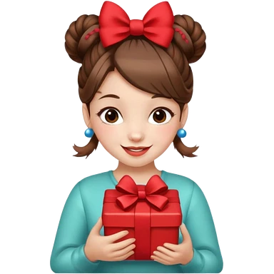 A cheerful young girl with brown hair styled in two playful buns adorned with red bows is winking and smiling. In her hands, she holds a small decorated emoji