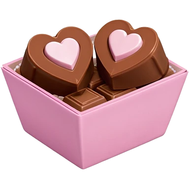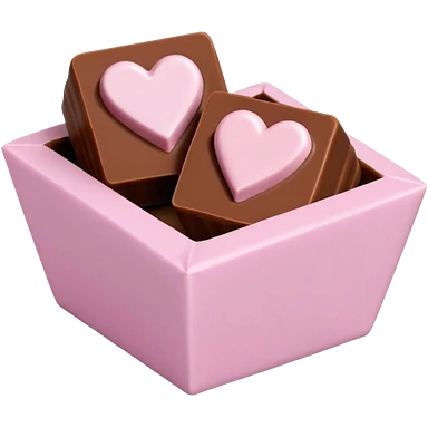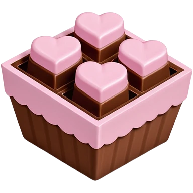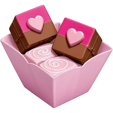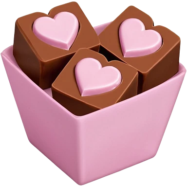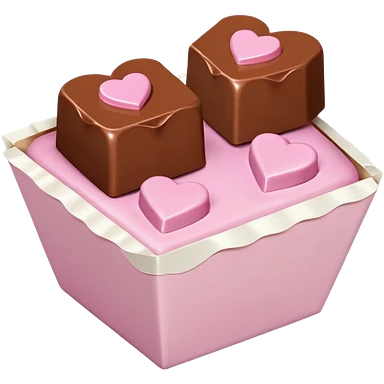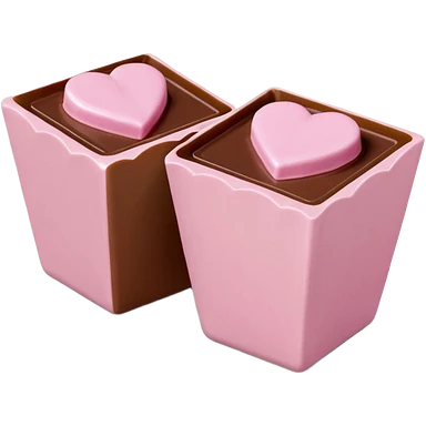 Two square milk chocolate Each of the two chocolates will have its own pralines only, Each praline is a sharp-edged cube with smooth glossy chocolate coating, placed in a small white fluted paper candy cup. On top of each cube is a flat pastel pink heart-shapedwith fine sugar crystal sparkle. emoji