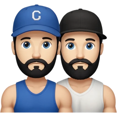 two guys, a gay couple. Guy on right, curled black hair sticking out under a baseball cap, long black beard, blue eyes, chiseled features, very tanned and very muscular. The other, pale white skin tone, very short black hair, a short beard, brown eyes, toned body. emoji