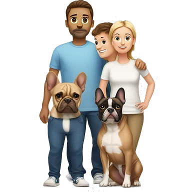 1 Father 1 Mother and 1 young boy who is half as tall as the parents, standing in front of their house with a dog next to them emoji