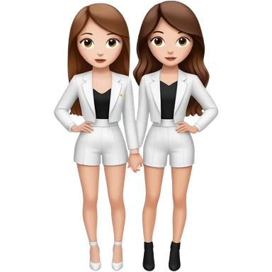 👯♀️ generate this emoji, as two white girls, bffs, the same pose but maybe the outfit cuter. we are models. both with brown hair. one girl in white outfit, the other in black. luxury outfits emoji