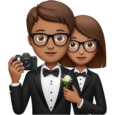 Un fotógrafo con pelo moreno, gafas, cámara en la mano derecha, fotografiando una boda emoji
