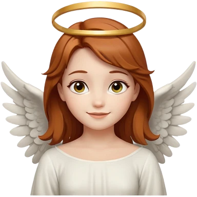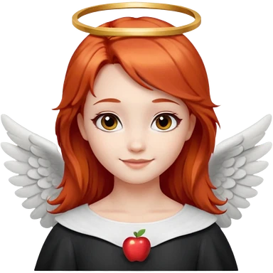 милая девушка ангел с нимбом и крыльями, с рыжими прямыми волосами по плечи, с черными макияжем глаз, тонкими бровями, с улыбкой, в стиле Apple avatar emoji