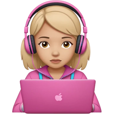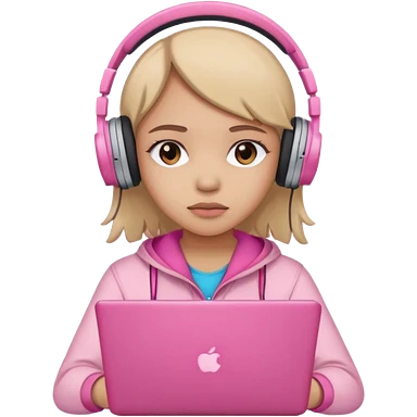 a girl with a pink laptop with headphones, color outline icon style, looking sad emoji