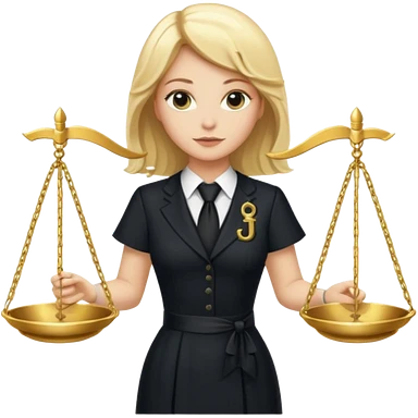 woman lawyer blanche et blonde habillée avec une robe noire longue et une cravate blanche, avec la balance de la justice derrière elle emoji