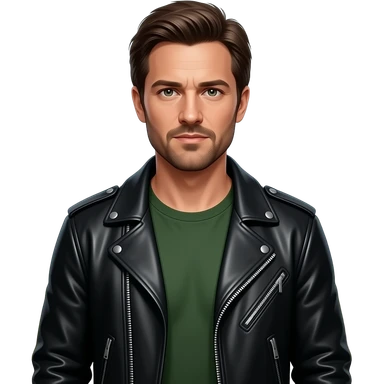generate emoji style guy with slick James dean hair with front tendrils, mustache and goatee facial hair, wearing a white shirt and a black leather jacket , several silver piercings in ear, with dark brown hair and make eyes more almond shaped inspired by the image I shared emoji