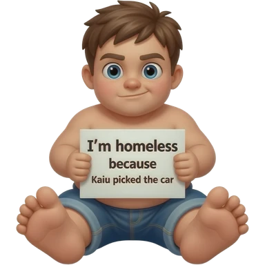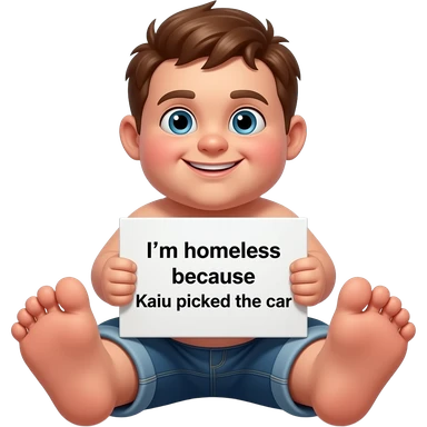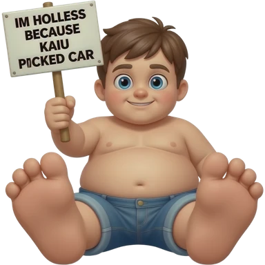 make a ugly megamind brown haired kid with a sign that says im homeless because kaiu picked the car and make him have big massive feet and no shirt and make sure hes fat make him have chubby face cheeks and make him smirking and make him realistic emoji