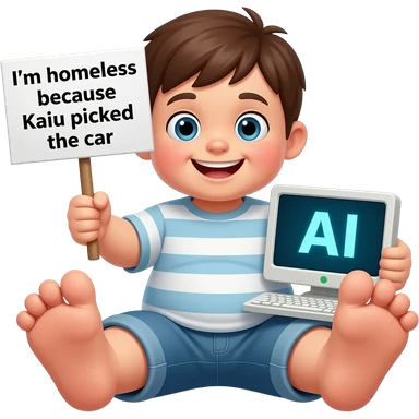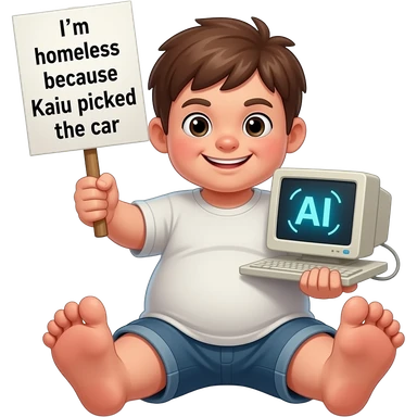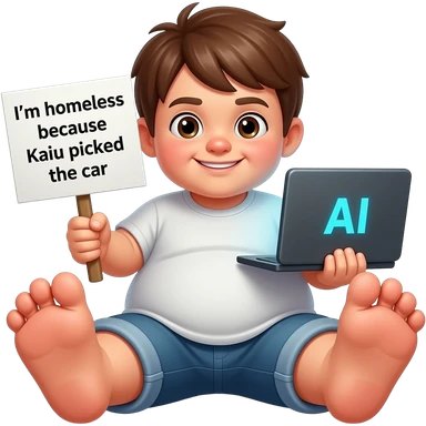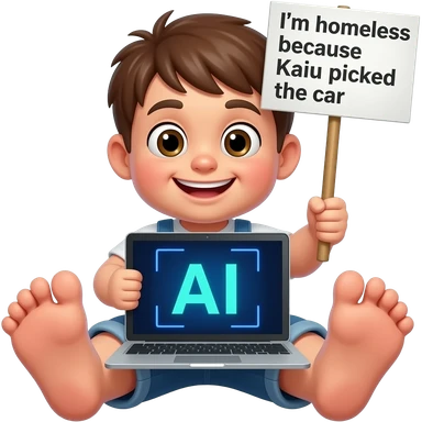 make a ugly brown haired kid with a sign that says im homeless because kaiu picked the car and make him have massive feet and make sure hes fat make him have chubby cheeks and make him smirking and make him stupid and make him have a computer with ai on it emoji