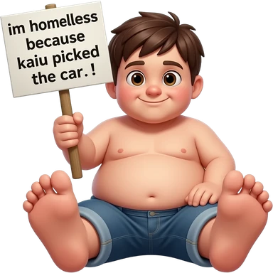 make a ugly megamind brown haired kid with a sign that says im homeless because kaiu picked the car and make him have big massive feet and no shirt and make sure hes fat emoji