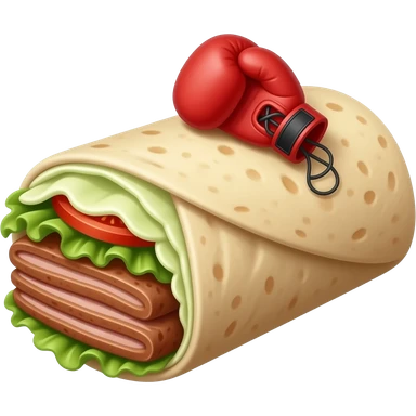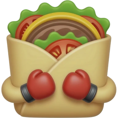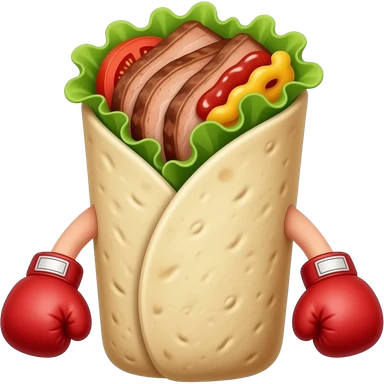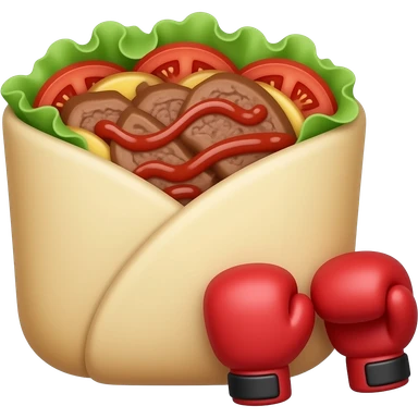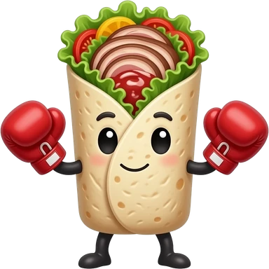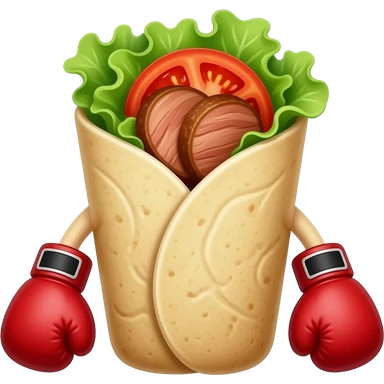Doner kebab emoji, clearly visible layered kebab meat slices (not sausage), with salad, tomato and sauce, wrap visible, small boxing gloves, no arms or legs, cute competitive face, clean glossy emoji style emoji